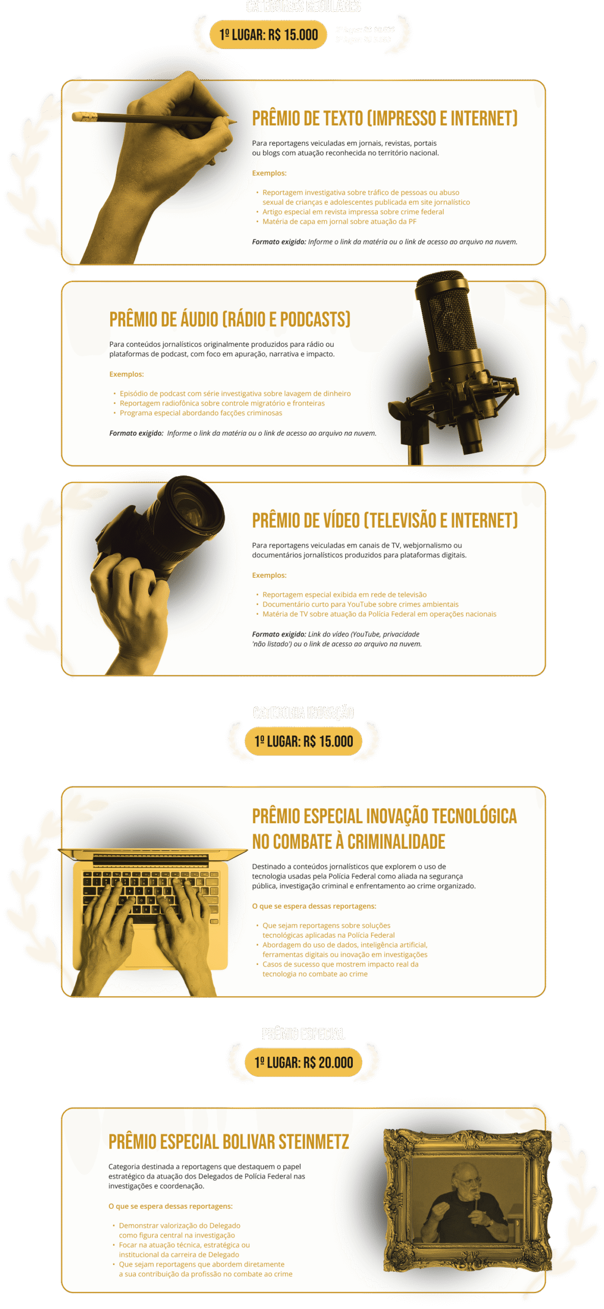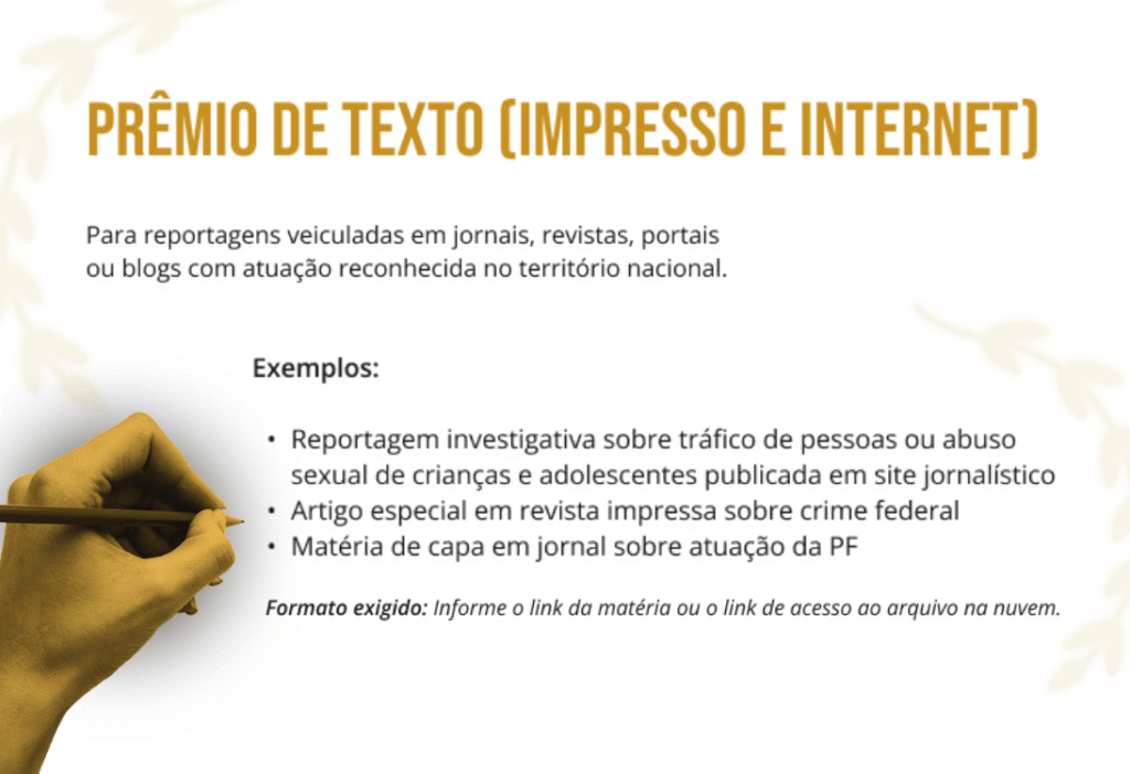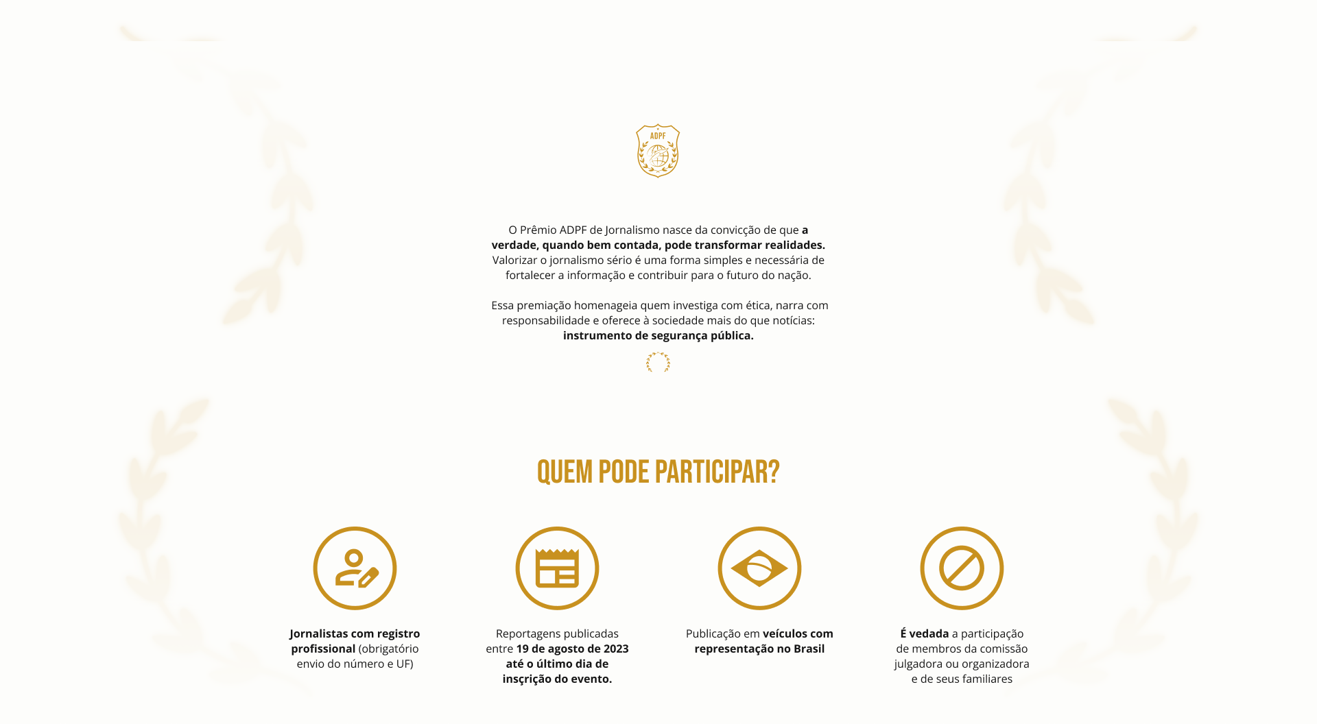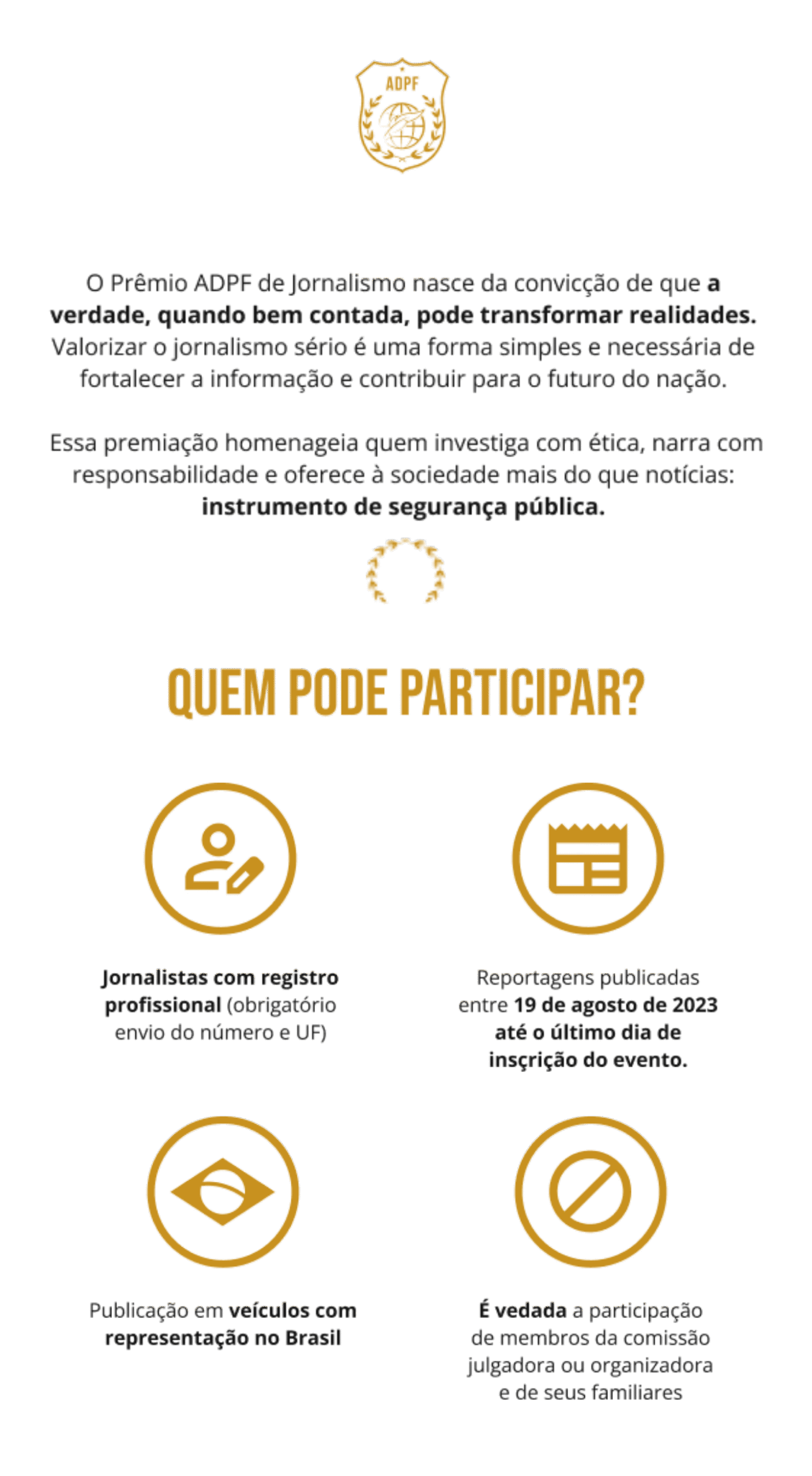 Se você produziu matérias que abordam temas ligados às atribuições constitucionais da Polícia Federal, ela merece ser vista. Inscreva-se na 1ª Edição do Prêmio ADPF de Jornalismo. Inscrições até 30/09